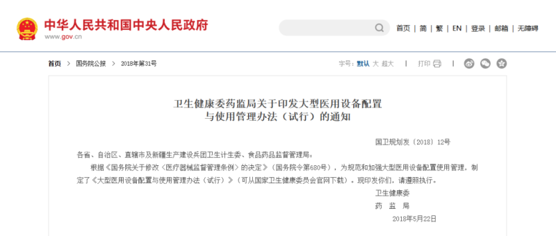 根據(jù)《大型醫(yī)用設(shè)備配置與使用管理辦法(試行)》,大型醫(yī)用設(shè)備,是指使用技術(shù)復(fù)雜、資金投入量大、運(yùn)行成本高、對醫(yī)療費(fèi)用影響大且納入目錄管理的大型醫(yī)療器械。
