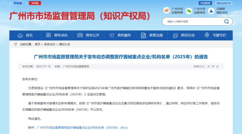 7月10日,廣州市市場(chǎng)監(jiān)督管理局發(fā)布了動(dòng)態(tài)調(diào)整后的醫(yī)療器械重點(diǎn)企業(yè)/機(jī)構(gòu)名單(2025年),共有廣州邁普再生醫(yī)學(xué)科技股份有限公司、廣州萬(wàn)孚生物技術(shù)股份有限公司、廣州衛(wèi)視博生物科技有限公司、廣州科萊瑞迪醫(yī)療器材股份有限公司等108家企業(yè)上榜,而根據(jù)《廣州市市場(chǎng)監(jiān)督管理局關(guān)于組織實(shí)施2025年度廣州市醫(yī)療器械注冊(cè)申報(bào)前置技術(shù)服務(wù)項(xiàng)目的通知》,上榜企業(yè)可享受醫(yī)療器械注冊(cè)申報(bào)前置技術(shù)服務(wù),具體如下: