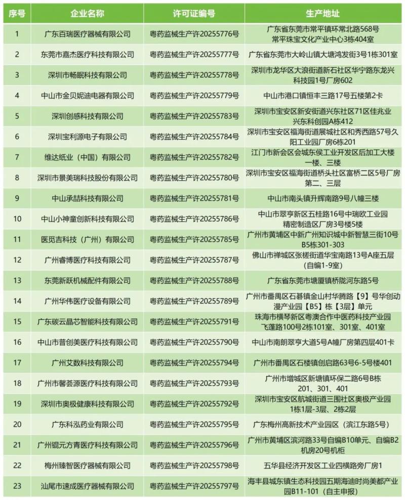 近日,廣東省藥監(jiān)局公布了《2025年6月醫(yī)療器械生產(chǎn)許可證核發(fā)清單》,據(jù)該公開數(shù)據(jù)顯示,2025年6月,廣東百瑞醫(yī)療器械有限公司、深圳市暢眠科技有限公司、維達(dá)紙業(yè)(中國)有限公司、深圳市景美瑞科技股份有限公司等共計(jì)23家企業(yè)新拿到了醫(yī)療器械生產(chǎn)許可證,具體明細(xì)如下: