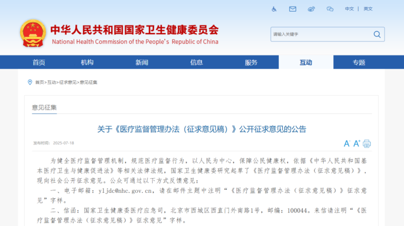 近日,國家衛(wèi)健委發(fā)布《醫(yī)療監(jiān)督管理辦法(征求意見稿)》(以下簡稱《辦法》),并向社會(huì)公開征求意見。