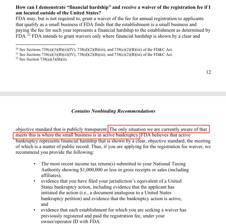 FDA 僅會(huì)在申請(qǐng)人通過(guò)公開透明的明確客觀標(biāo)準(zhǔn)證明其經(jīng)濟(jì)困難時(shí)授予豁免。目前FDA確認(rèn)符合該標(biāo)準(zhǔn)的 唯一情形 為:企業(yè)處于 active bankruptcy(在審破產(chǎn)程序)狀態(tài)(FDA認(rèn)為在審破產(chǎn)程序符合“明確客觀標(biāo)準(zhǔn)”,且該狀態(tài)屬于公開法律記錄)。