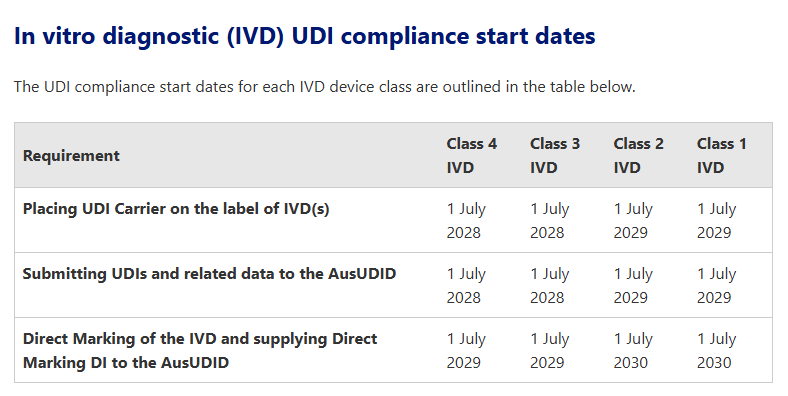 這其中,最早實(shí)施UDI的為Ⅲ類及Ⅱb類醫(yī)療器械,需要在2026年7月1日起將UDI載體放在設(shè)備標(biāo)簽上及向AusUDID 提交 UDI-DI 和相關(guān)數(shù)據(jù),最晚的則是1類和2類IVD,需要在2030年1月1日完成有關(guān)UDI的所有操作。